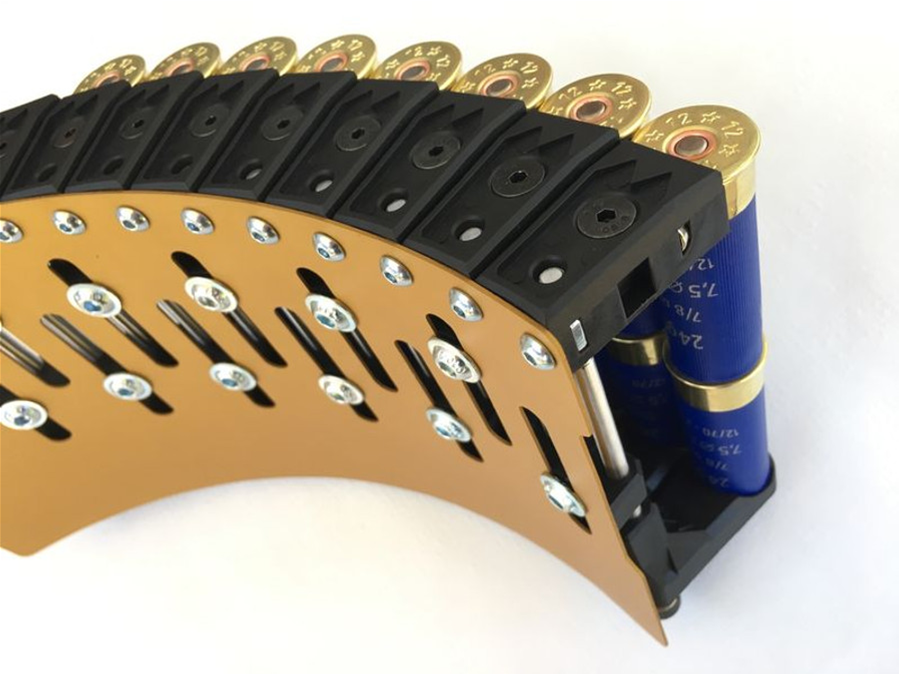 Shells are held tightly within the geometry of the holder. The short release is done by detaching the upper shells from high strength magnets. This releases the shells from the holder completely, allowing a very effortless and fast reloading. When not reloading, the system will keep the shells securely in place during running and jumping.