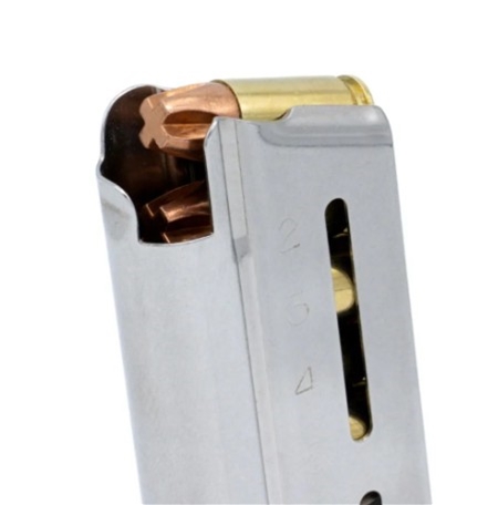NOTE: Some KimberĀ® 1911 handguns have barrel feed ramps that are left undressed at the factory and will interfere with the ramped front of this magazine. The barrel can be easily modified by a gunsmith to provide the proper clearance required.