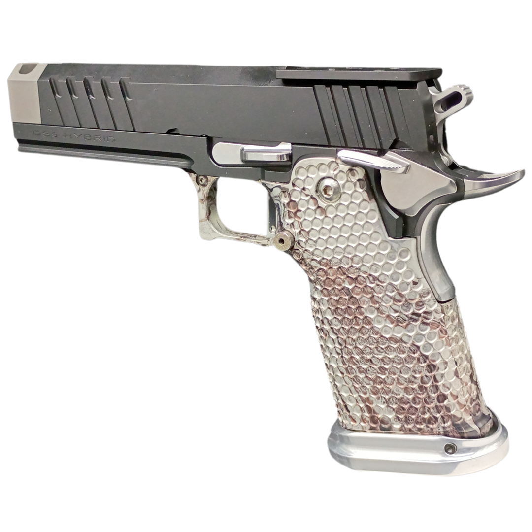 DS9 Hybrid IDPA – Black Nitride Slide & Frame, Ambi-Safety, Slide Stop, Stationary Beavertail (not a functional grip safety), Barrel, Anodized Aggressive Aluminum Grip, Titanium Single Port Compensator