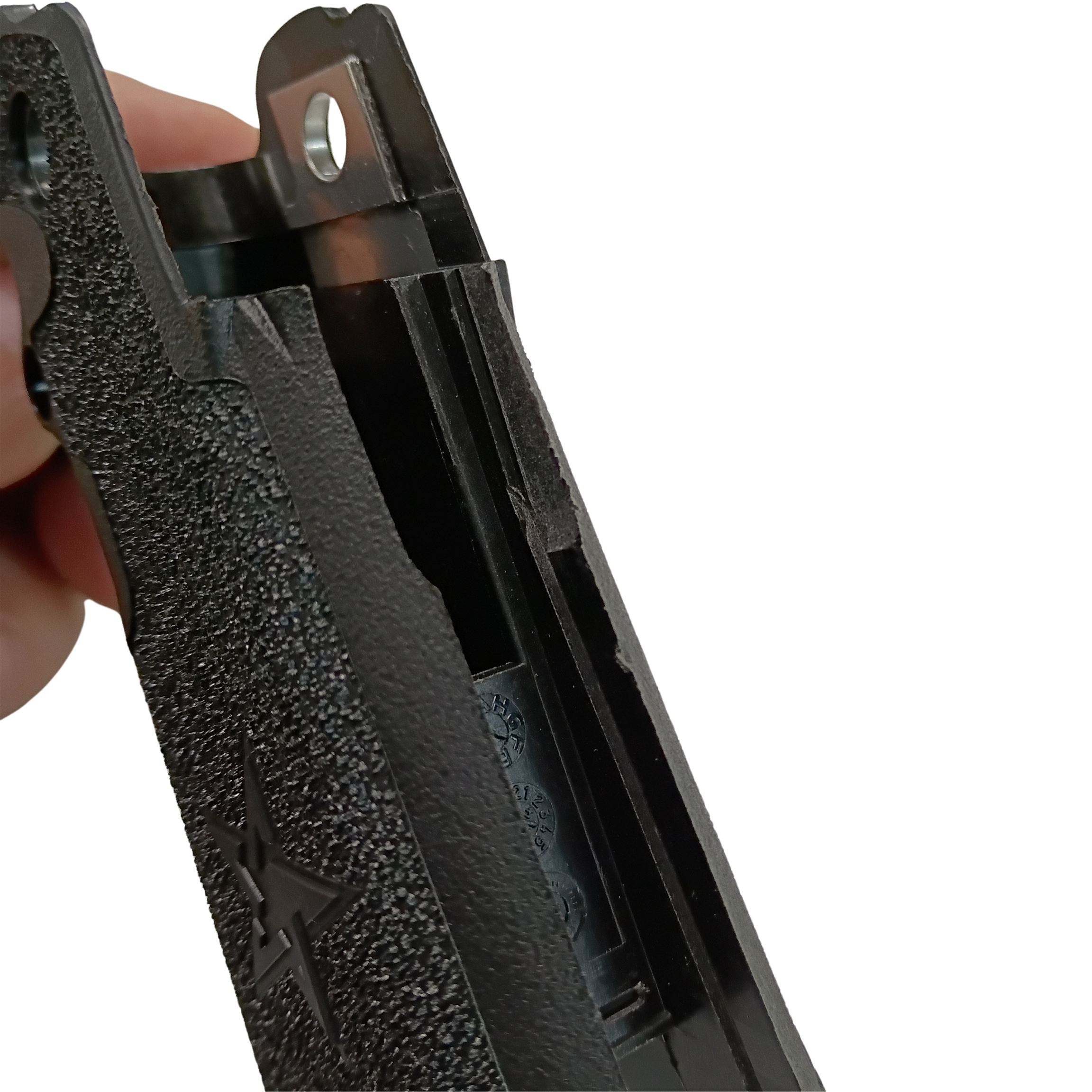 The majority of material removal will likely be on the metal pieces that contain the main screw holes. There may also be some material that needs to be removed on the sides of the grip above the trigger guard, where it fits into the frame cut leading up to the trigger guard screw.