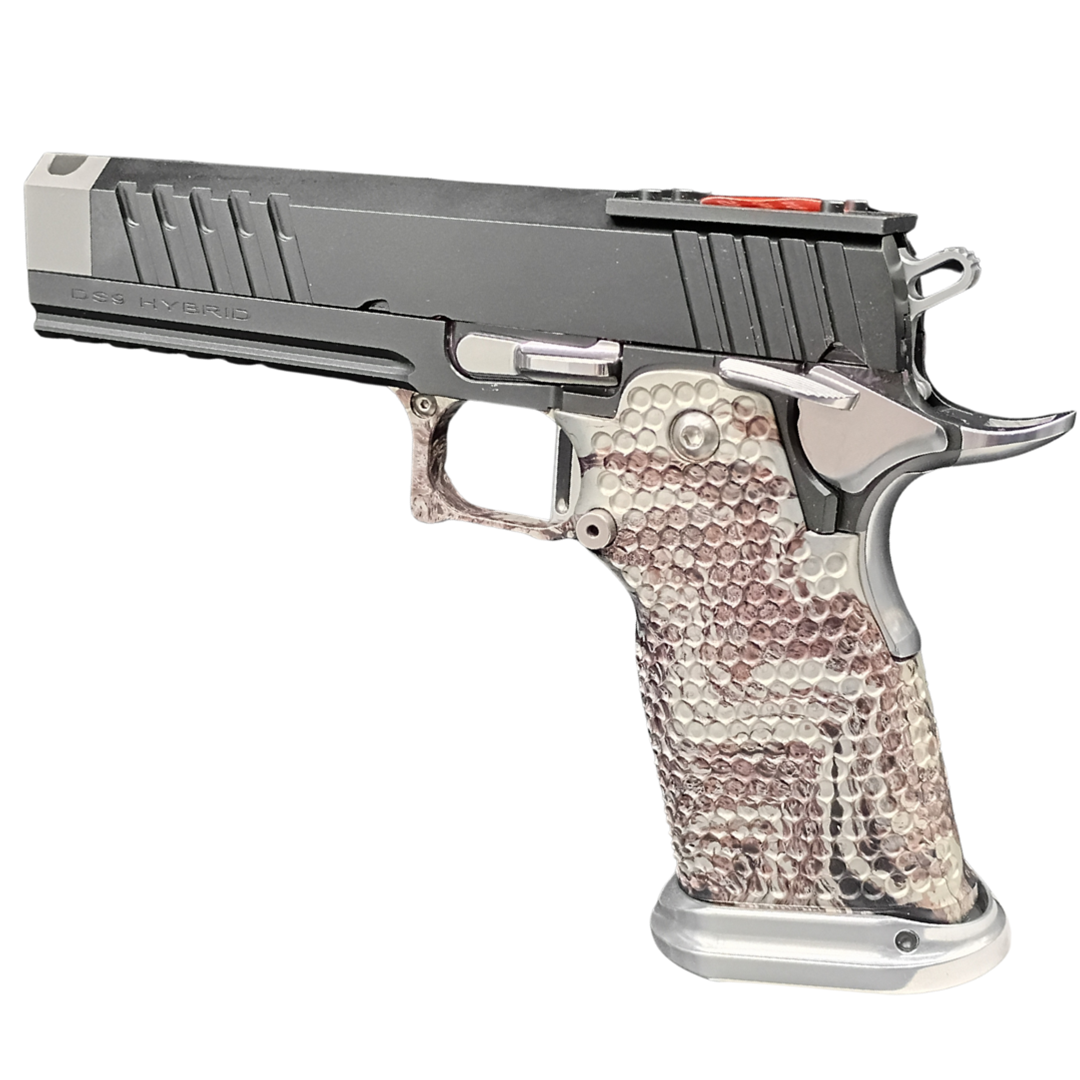 DS9 Hybrid IDPA – Black Nitride Slide & Frame, Ambi-Safety, Slide Stop, Stationary Beavertail (not a functional grip safety), Barrel, Anodized Aggressive Aluminum Grip, Titanium Single Port Compensator
