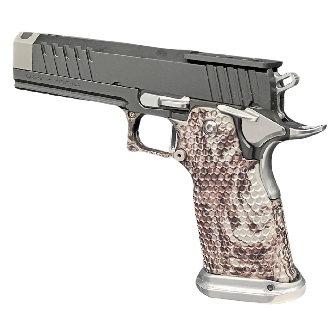 DS9 Hybrid IDPA – Black Nitride Slide & Frame, Ambi-Safety, Slide Stop, Stationary Beavertail (not a functional grip safety), Barrel, Anodized Aggressive Aluminum Grip, Titanium Single Port Compensator