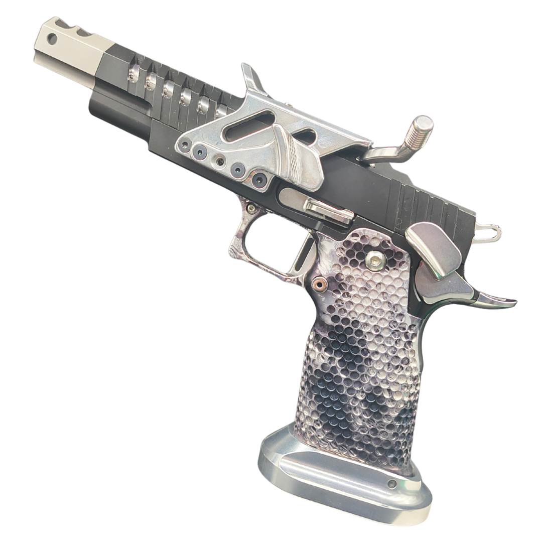 This Race gun is a designed to perform in USPSA Steel Challenge competitions. This is very similar to our Open Pistol, but allows the use of 9mm Minor (Factory Loaded 9mm ammo). It also includes a lighter aluminum grip for quick transitions of the pistol during these competitions.