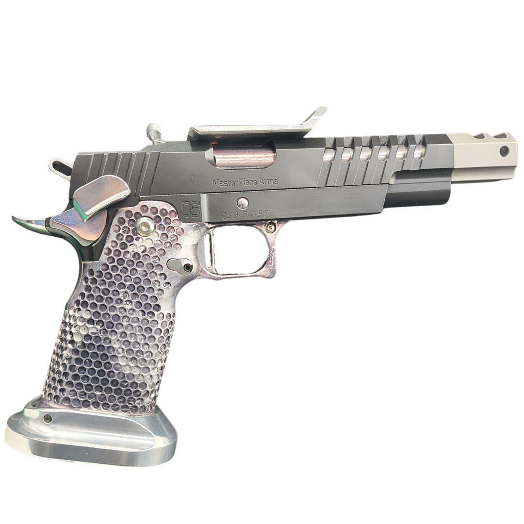 This Race gun is a designed to perform in USPSA Steel Challenge competitions. This is very similar to our Open Pistol, but allows the use of 9mm Minor (Factory Loaded 9mm ammo). It also includes a lighter aluminum grip for quick transitions of the pistol during these competitions.