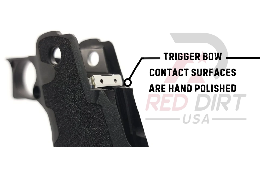 Say goodbye to the inaccurate, time-consuming way of adjusting the pretravel on your double stack 1911 style pistols. With the Speed Tuned trigger (ST Trigger for short) we replaced the pretravel tabs on the trigger bow with a hex screw. This allows the user to precisely and quickly tune the pretravel of their trigger perfectly to their liking. Unlike other triggers, the ST Trigger is adjusted with the hammer cocked giving you the perfect pretravel adjustment in minutes. The Kimber 2K11 Red Dirt USA ST trigger is available in five different trigger shoe lengths.