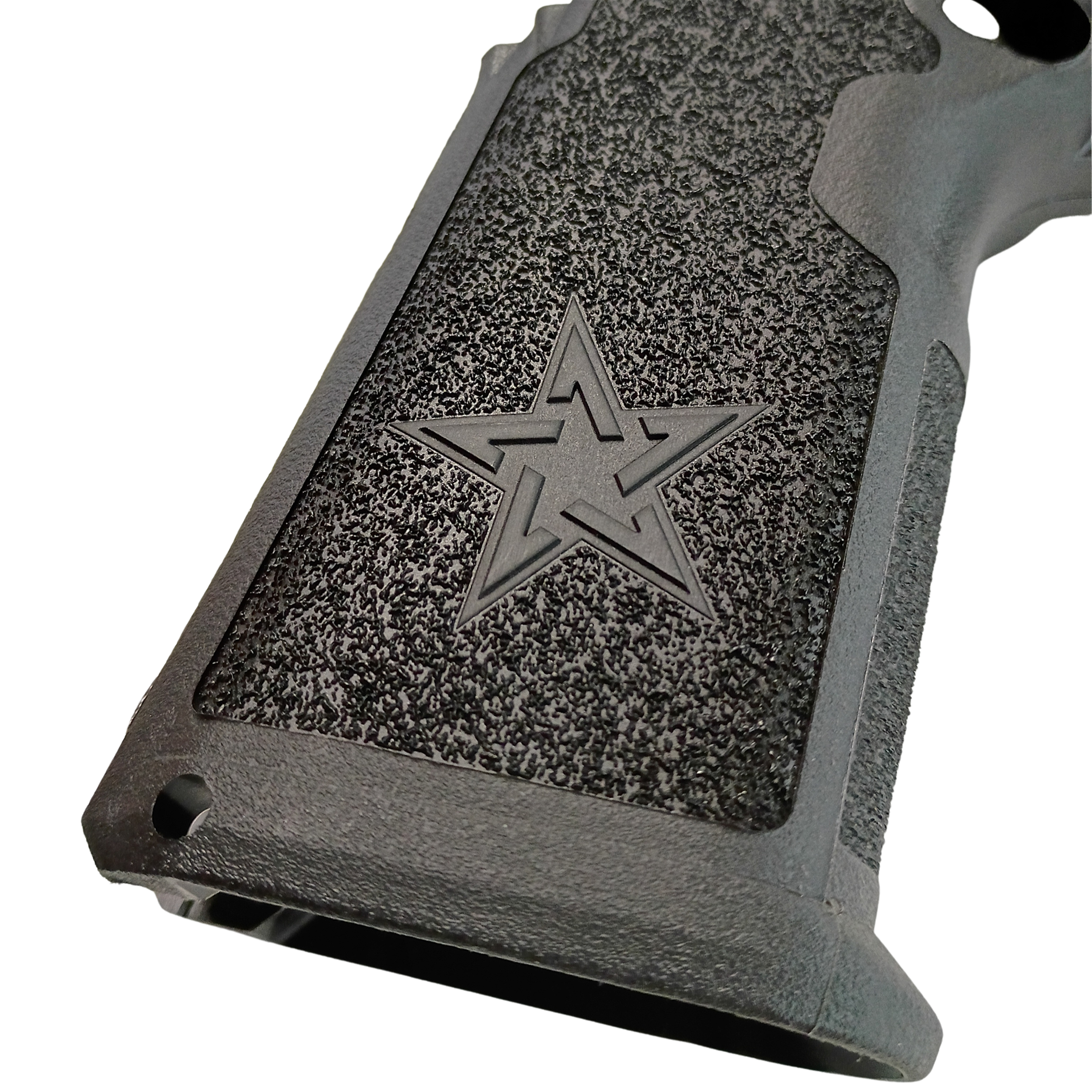 Staccato V2 grip is a full-size grip and will be compatible with 17rd (126mm) and 20rd (140mm) magazines. Does not include the main spring housing, magwell or hardware.