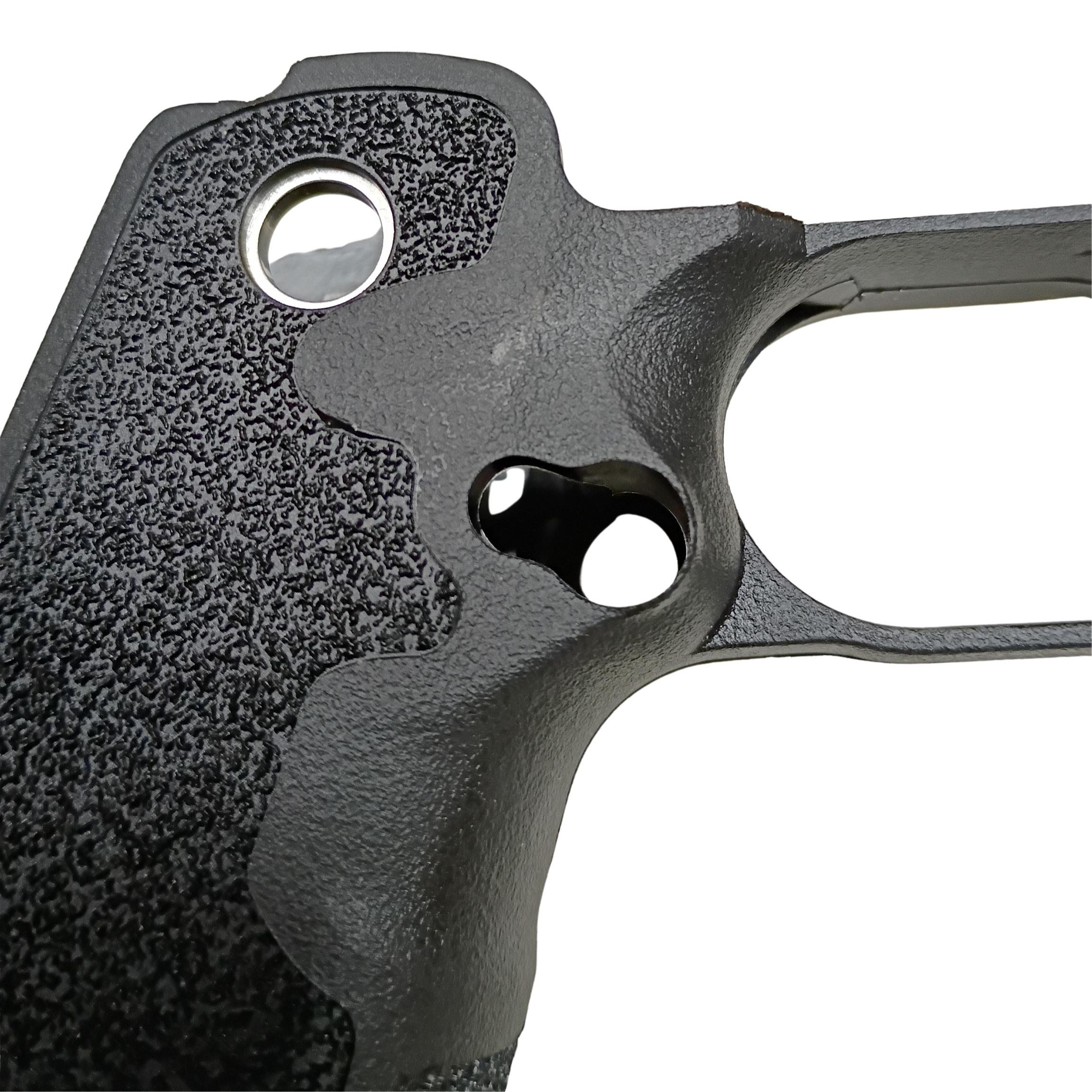 The majority of material removal will likely be on the metal pieces that contain the main screw holes. There may also be some material that needs to be removed on the sides of the grip above the trigger guard, where it fits into the frame cut leading up to the trigger guard screw.